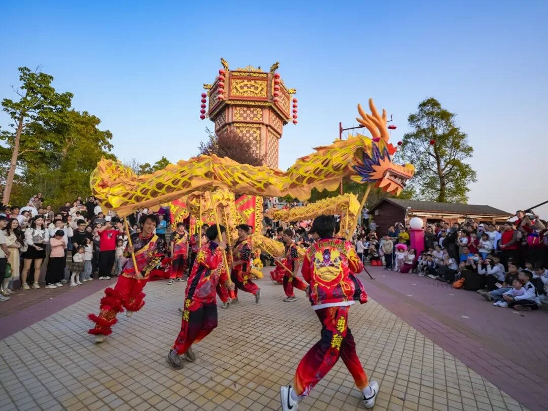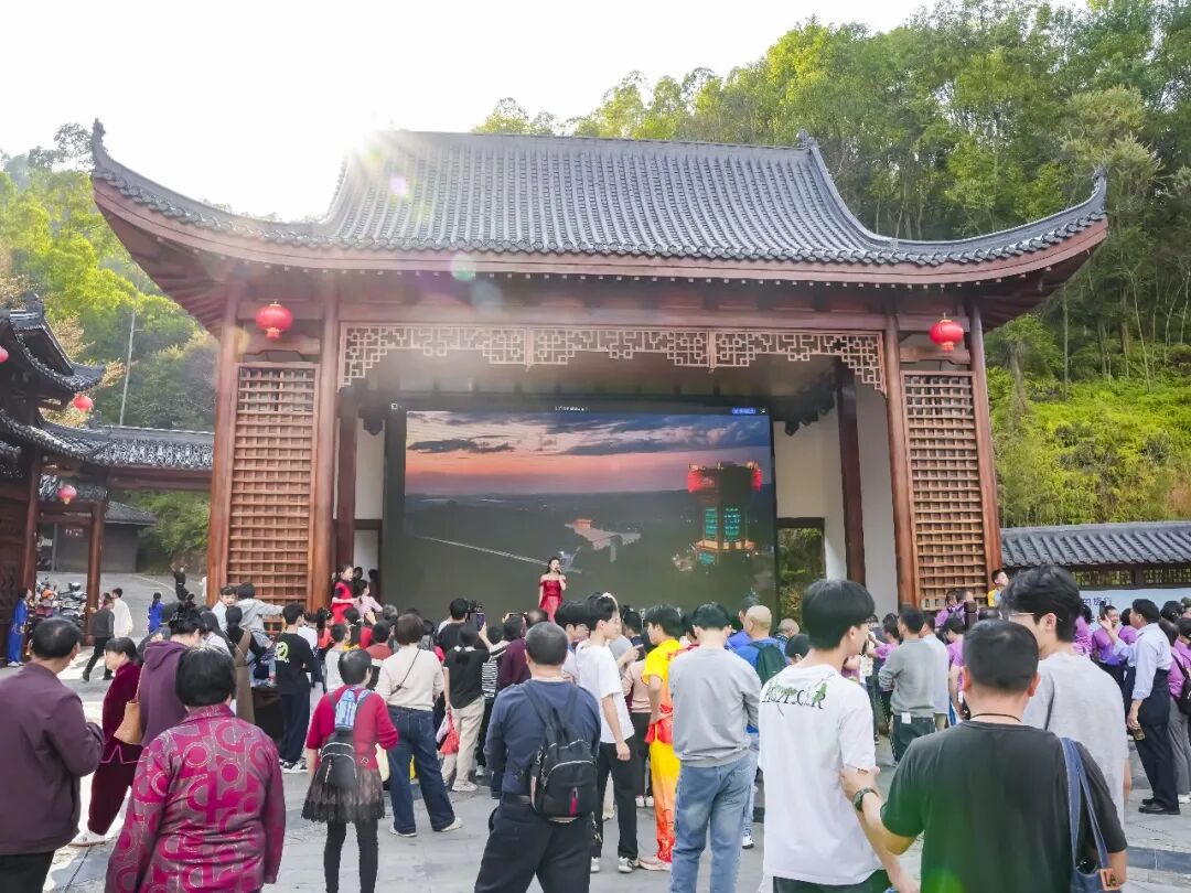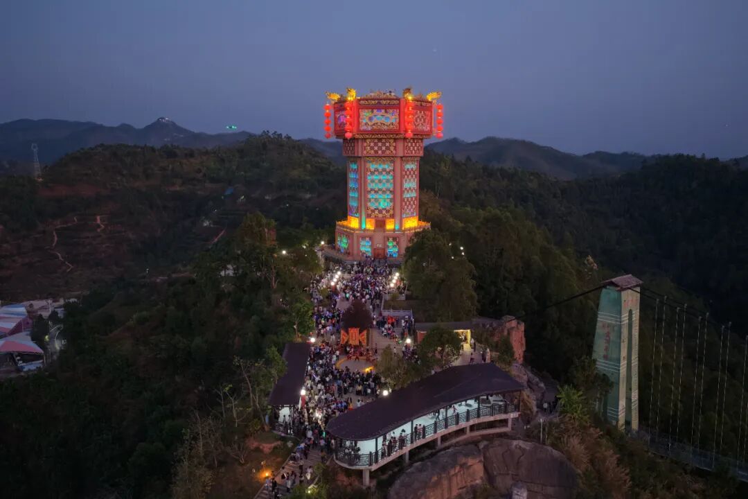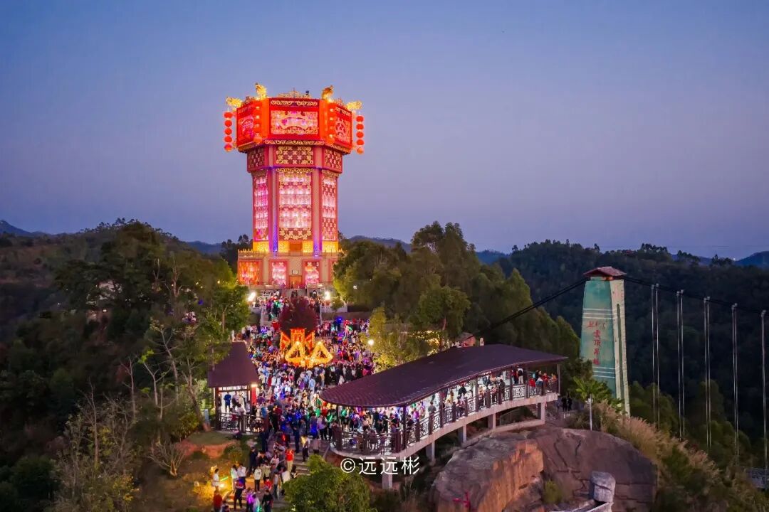 18时28分,花灯楼亮灯仪式正式启动。随着倒计时的声音在园区内响起,在全场瞩目下,出席仪式的领导嘉宾共同按下启动装置。瞬间,花灯楼被逐步点亮,整座建筑宛如一盏悬浮于山间的巨型灯笼,璀璨夺目。整个熙和湾弥漫着喜庆与温暖,数万游客一同沉浸在这场民俗派对当中。对兴宁人而言,上灯大过年。兴宁客家人以“灯”谐“丁”,饱含着对家族人丁兴旺、薪火相传的深切祈愿。此次花灯楼亮灯,是兴宁守护客家传统文化的生动实践,让花灯这一文化符号,成为彰显客家文脉、