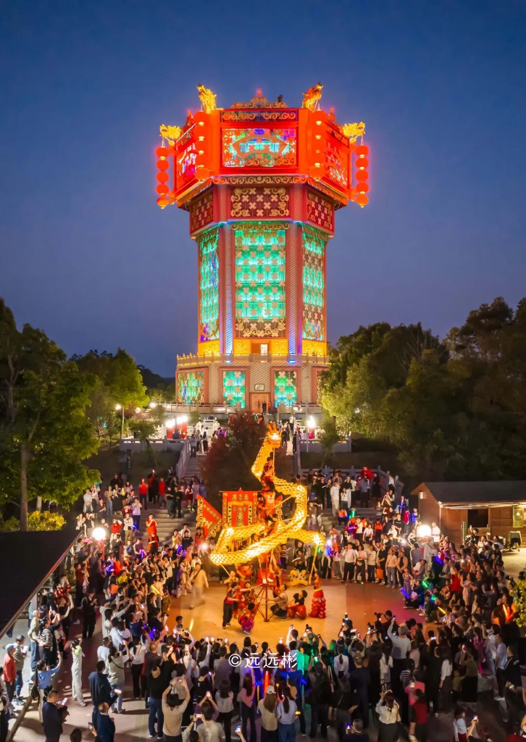 伴随着铿锵的锣鼓声,舞龙舞狮队伍从熙和广场缓步向花灯楼前行,为亮灯预热造势。