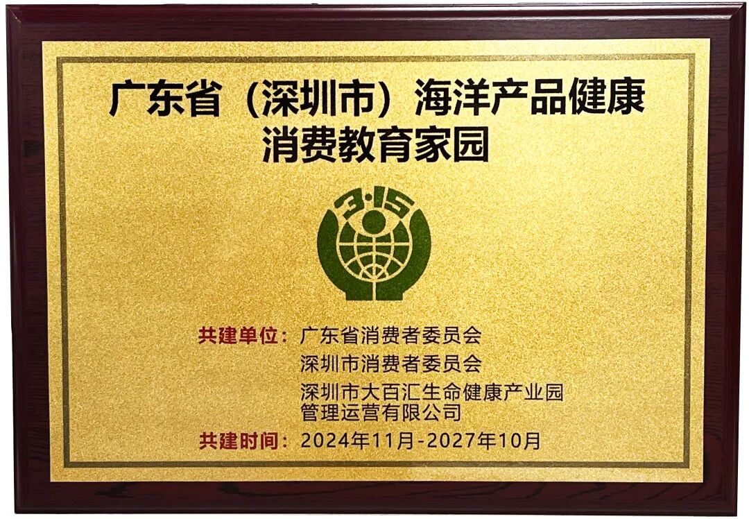 11月16日,由广东省消费者委员会、深圳市消费者委员会联合主办的2024年深圳消费教育家园市民巡礼系列活动暨年度总结仪式成功举办。会上为新一批11个获得广东省(深圳市)消费教育家园的单位举行授牌,大百汇生命健康产业园被成功认定为“广东省(深圳市)海洋产品健康消费家园”。